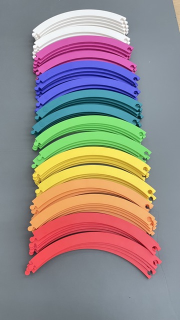 • Arcos de plástico coloridos alinhados verticalmente sobre fundo cinza