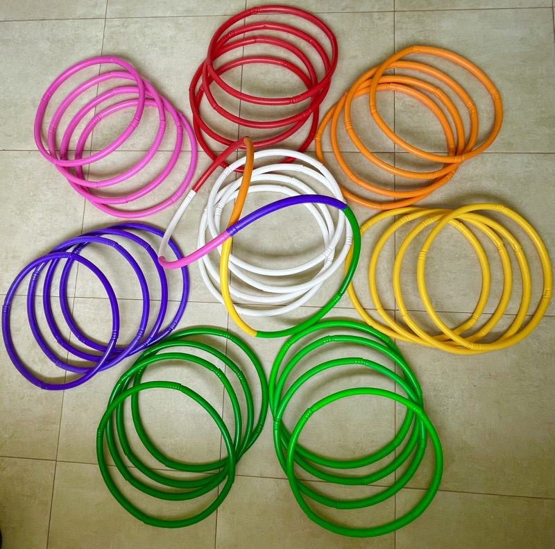 Conjunto de argolas coloridas em piso de azulejo claro