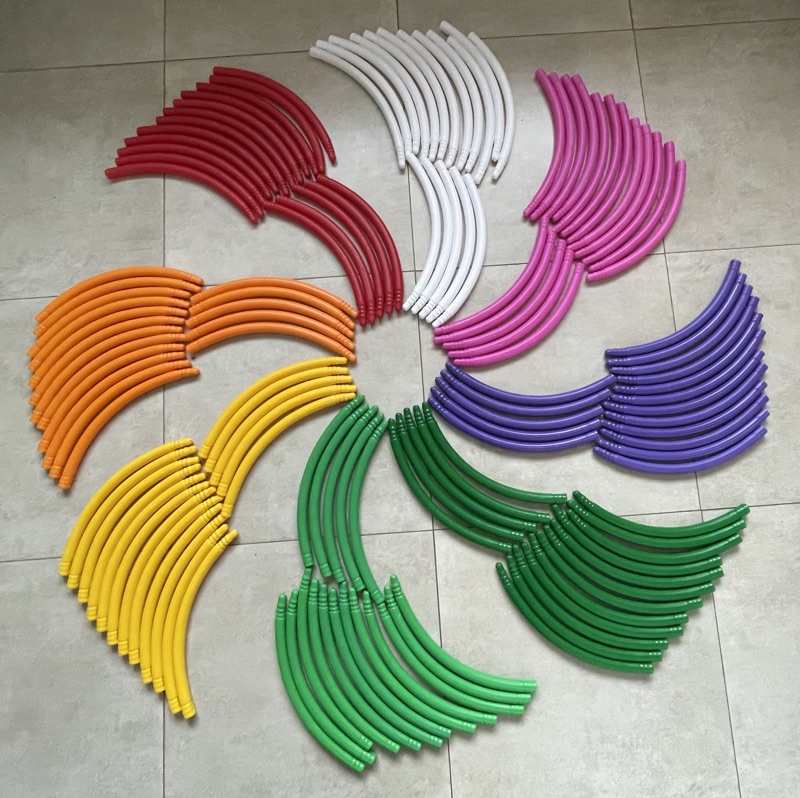 • Tubos flexíveis coloridos organizados em círculo no chão